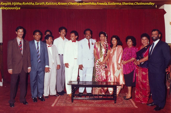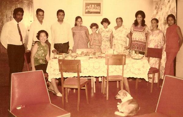 Doyne J (Brother) Douglas W (BIL) Trevor J, Shriyani J (Wife) Kanthi W, Fiona W, Mrs. Winifred J (Mother) Chitranganie J (Sister) Mary J (SIL) Sriani W (Sister) Pet dog Bimbo and seated Japanese visitor.