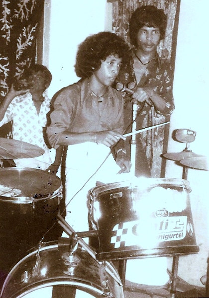 'Fireball Dance 1976' Wellawatte, Human mike stand - Joe (Princy) de Silva - Priyantha Benedict at rear and Kamy Lye on drums